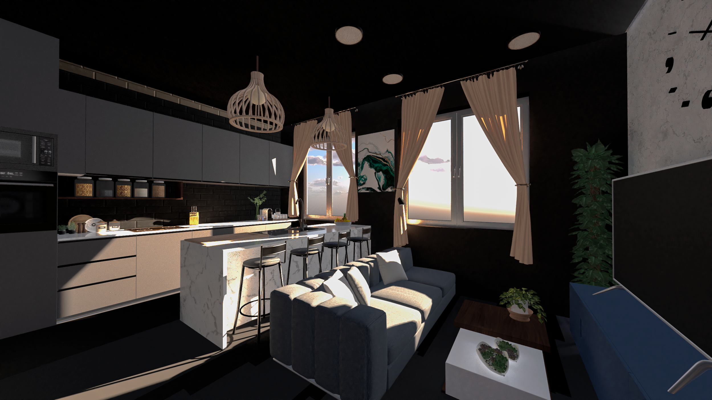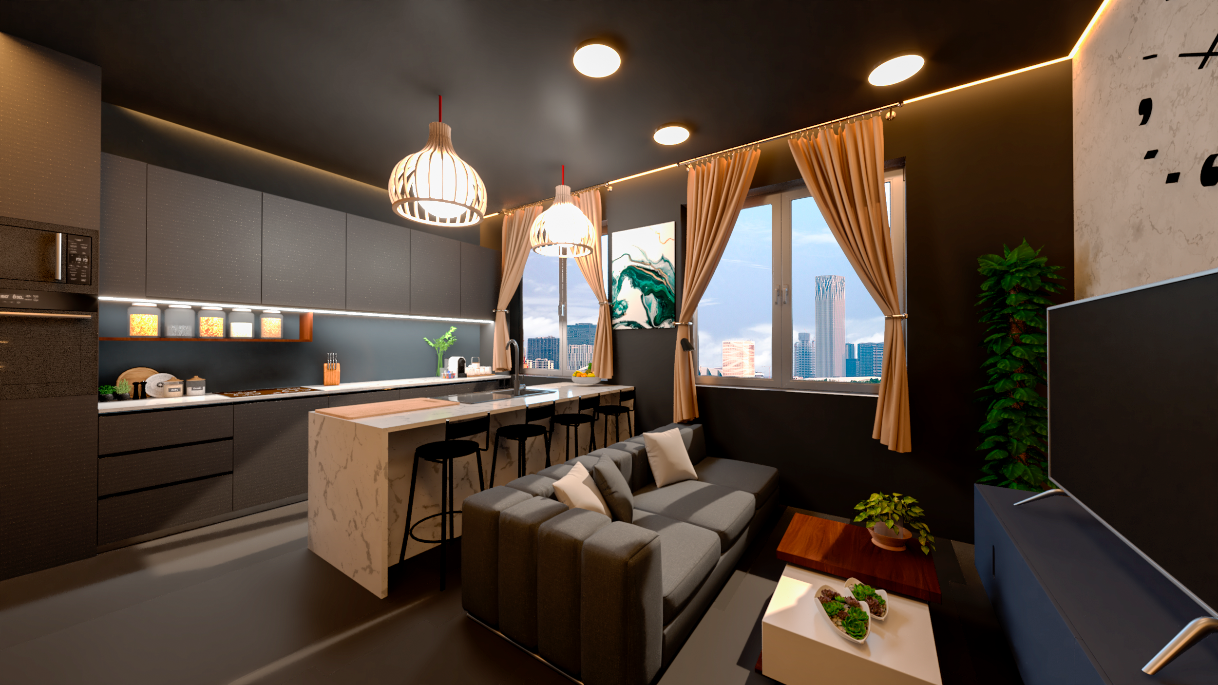 Um maravilhoso T2 com 60m2, Descubra o auge da sofisticação e funcionalidade com esta cozinha de design premium. Armários em antracite profundo, combinados com um requintado forno embutido ILVE Grigio Lusso, Esta deslumbrante cozinha, com os seus tons ricos de antracite com uma elegante espaçosa ilha central e assentos elegantes convida à convivência e criar memórias inesquecíveis, perfeita para entretenimento ou para um pequeno-almoço descontraído, complementa a atmosfera acolhedora e moderna. enquanto os detalhes cuidadosamente selecionados garantem que cada momento culinário seja uma experiência de puro prazer. Prepare-se para elevar o seu estilo de vida!
