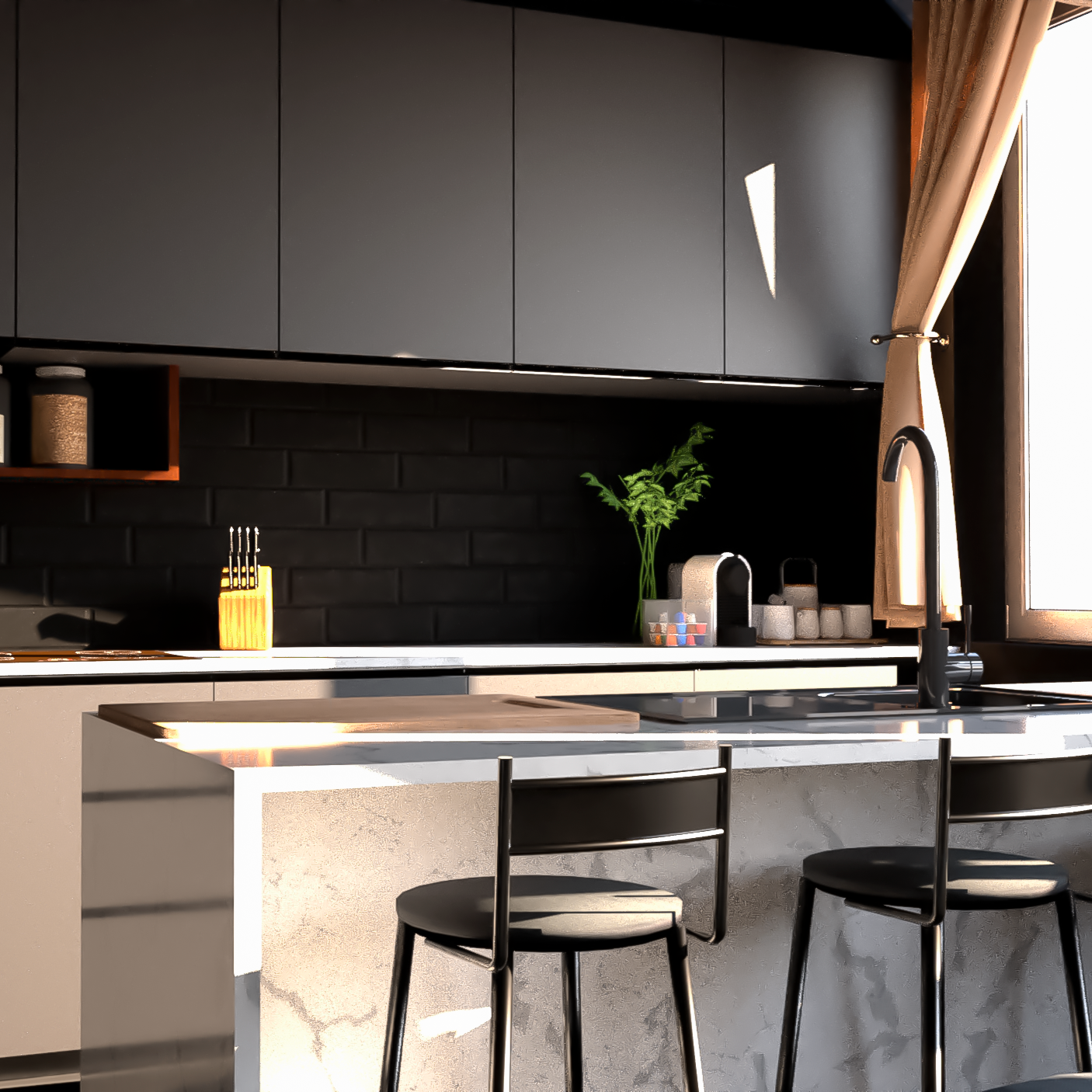 A ilha central, que também serve como balcão para refeições rápidas, segue o mesmo padrão da bancada, com banquetas de design moderno com assentos pretos e estrutura metálica.