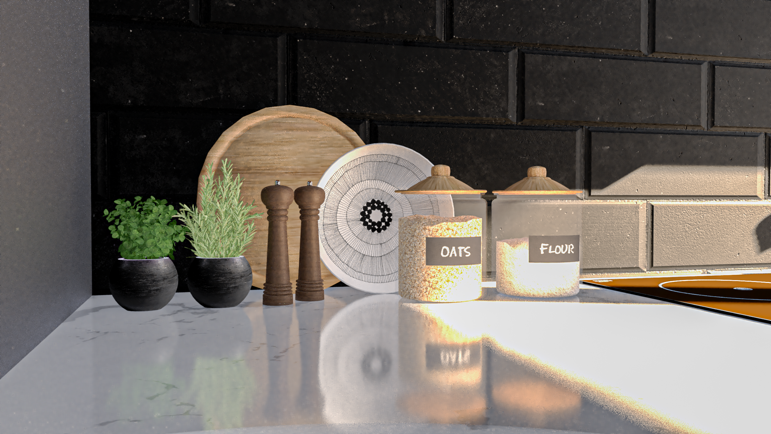 Uma prateleira de madeira clara, embutida e iluminada, serve como nicho para potes de temperos e mantimentos, adicionando um ponto de calor e organização.